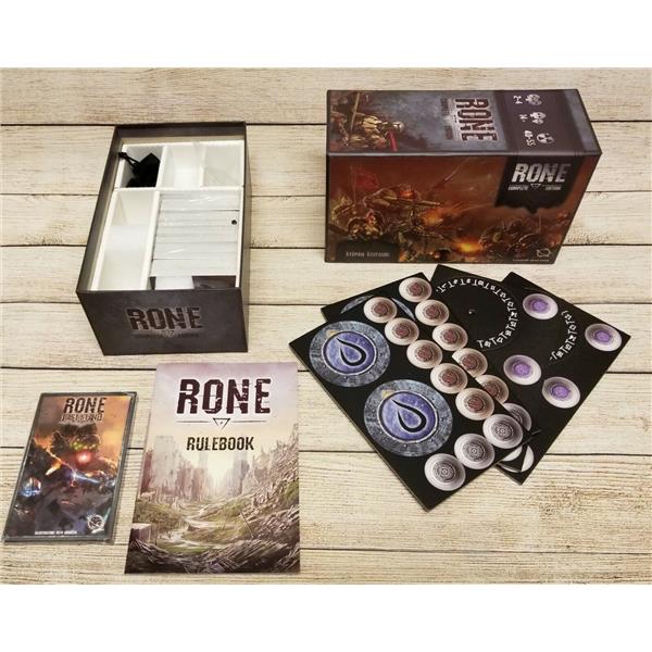 This Complete Edition of RONE includes the Core set with all released expansions in one big box. For back compatibility with the first or second edition, the cards are populated with an expansion symbol to easily distinguish which card belongs to which expansion.