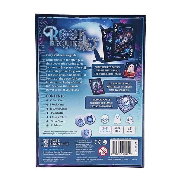 Every soul needs a guide. Usher spirits to the afterlife in this spooky trick-taking game for three to five players. Face off in a strategic duel for ghosts, each with unique modifiers you need the most. But beware of the powerful Rook lurking in each player’s hand, for they have the ultimate power to upset your plans.