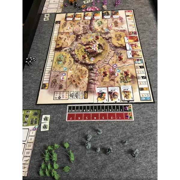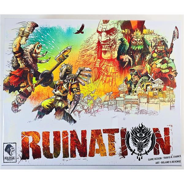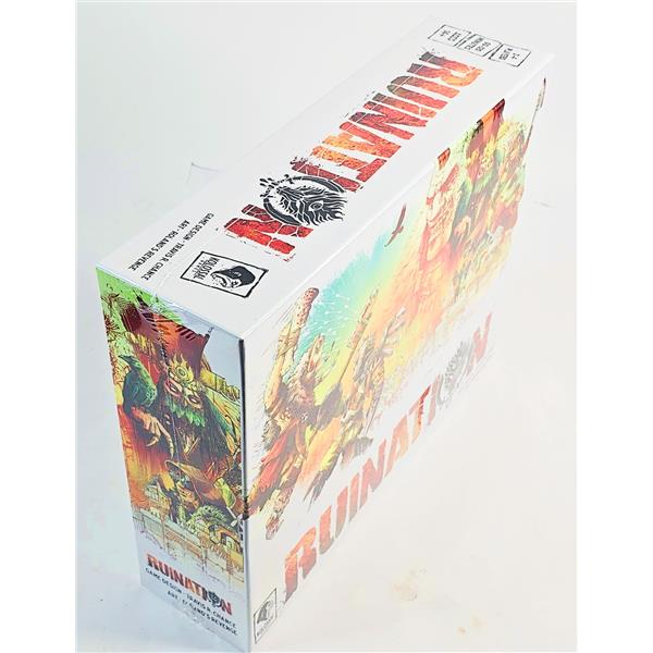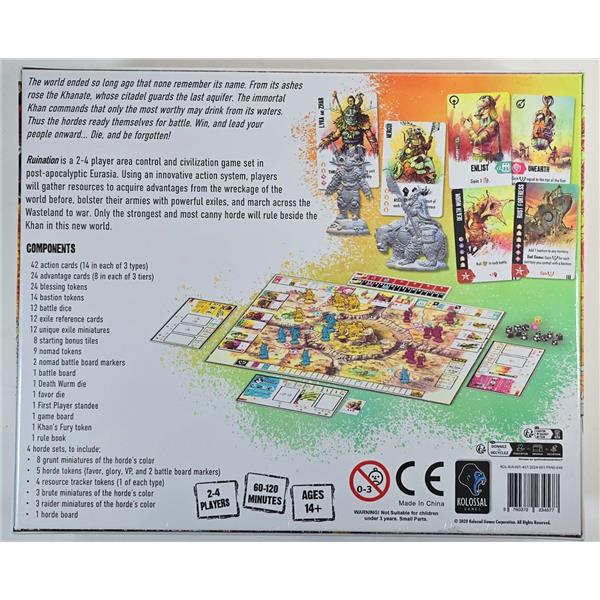 Ruination is a 2-4 player area control and civilization game set in post-apocalyptic Eurasia. Using an innovative action system, players will gather resources to acquire advantages from the wreckage of the world before, bolster their armies with powerful exiles, and march across The Wasteland to war. Only the strongest and most canny horde will rule beside the Khan in this new world.