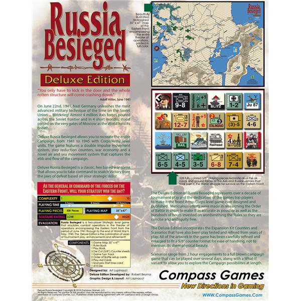 From Award Winning designer, Art Lupinacci, Russia Besieged covers the entire German campaign in the east from 1941 to the bitter end, in 1945. One of the finest Army/Corps level games on the market, Russia Besieged Deluxe edition has been overhauled from years of experience and nuances discovered in Tournament play, to bring you a richly detailed, east front experience you expect to see from this classic wargame.