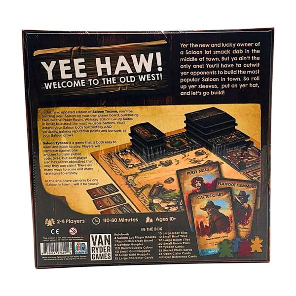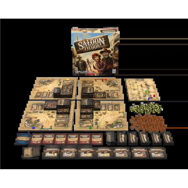 Players are Saloon owners in an old west gold rush town. They've purchased lots on the four corners of the main crossroads and need to expand their small establishments into thriving businesses. Their goal is to create massive centers for commerce and entertainment in the wilds of the West. To boost their success, they’ll need to attract the wealthy and famous citizens of the town while keeping away the less savory characters.