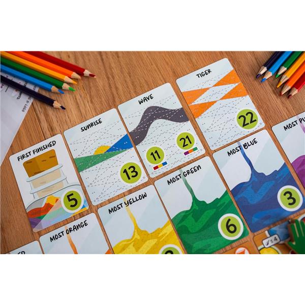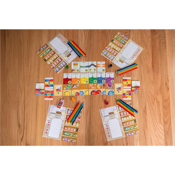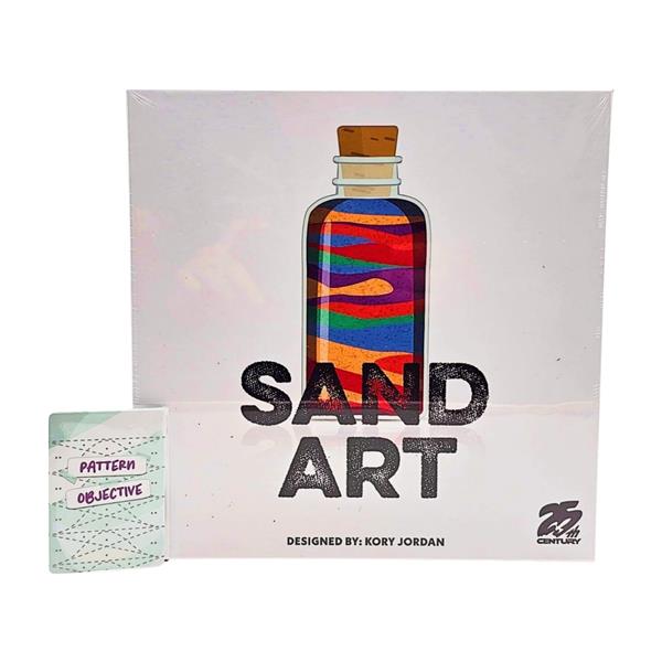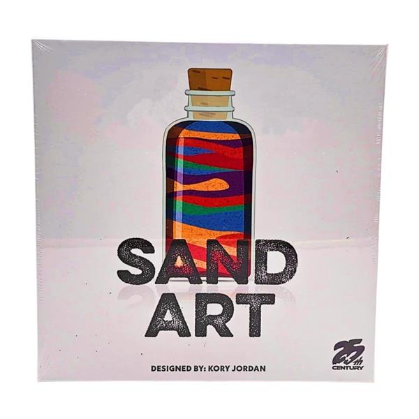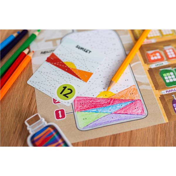 Sand Art is a unique entry in the "___ & write" style of games. During play, you move back and forth along a linear track of actions on the workbench, gathering different colors of sand in your supply, mixing primary colors of sand into new secondary colors, and pouring them into bottles to create patterns and images that will attract customers in your shop. Creating the most unique and visually pleasing bottles will earn you the most points.