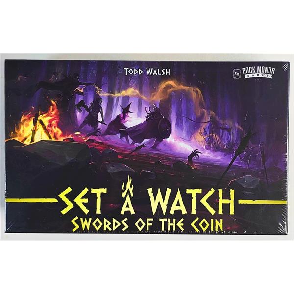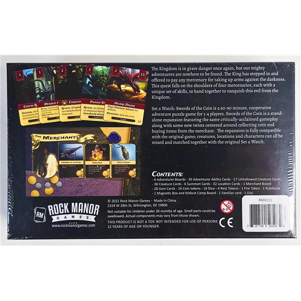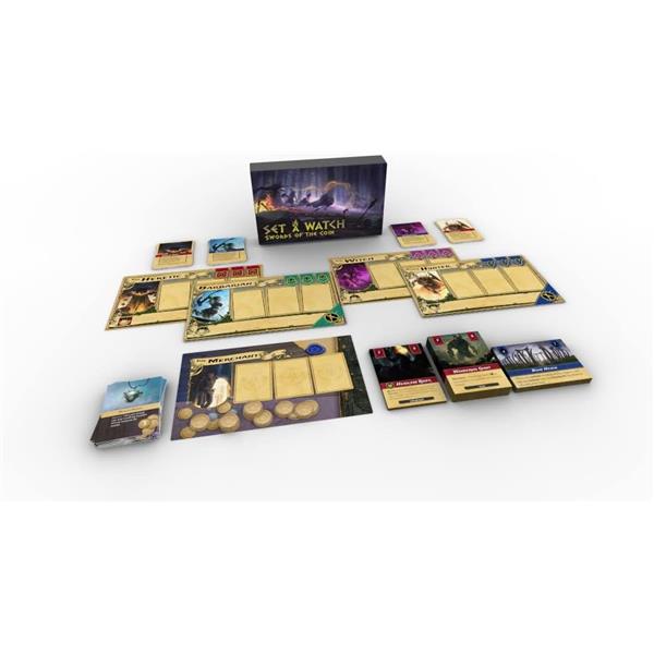 Set a Watch: Swords of the Coin is both a standalone game for 1-4 players and an expansion that can be combined with the original cooperative game. Featuring all new characters, this bunch of adventurers has to be motivated to work together. Every round you will visit all new locations and pick an adventurer to rest and get paid to take camp actions. You can use this coin to purchase powerful items from the new Merchant board and item deck. These items will assist the rest of the party on watch as they battle a line of all new creatures trying to make their way into camp. It is still a battle to keep the campfire burning! Use your wits and skill to fight for the light…or all will perish in the darkness.