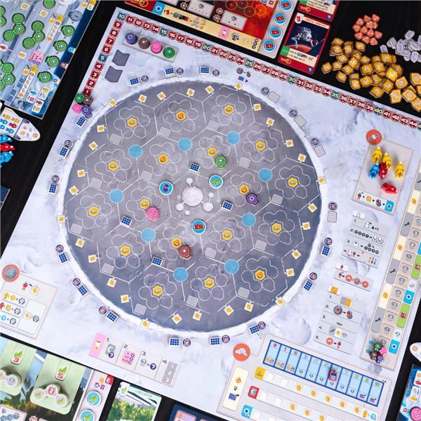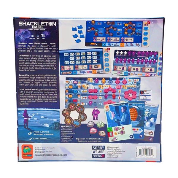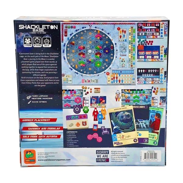 A permanent base is being built in the Shackleton crater at the Moon's South Pole. You're leading one of the space agencies that are working together to expand their presence on the base, while at the same time the three major corporations sponsoring the mission are each pursuing their own agenda. In Shackleton Base: A Journey to the Moon, you will build structures on the base, while also funding projects from the corporations that provide special abilities and scoring opportunities.