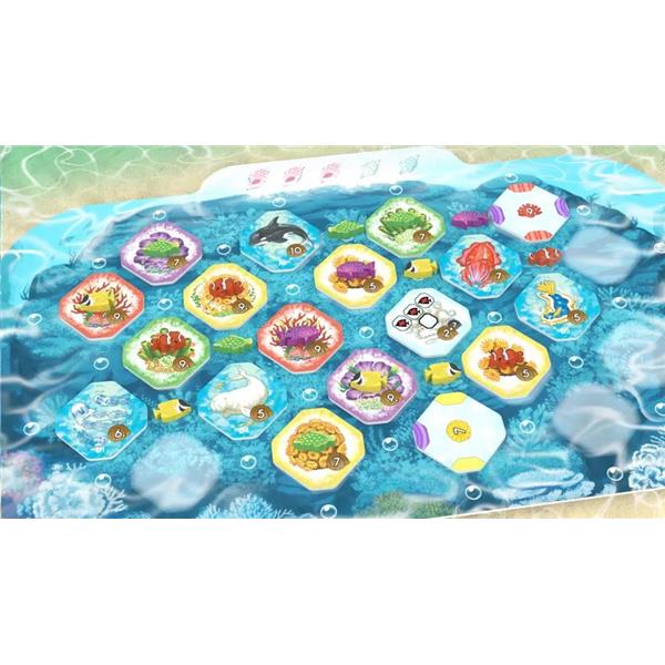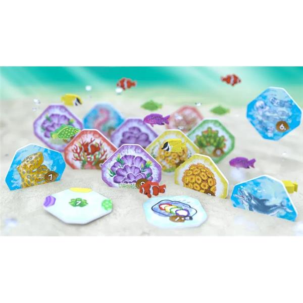On your turn, choose tiles showing fish, coral, or sea life, and place them on an empty space on your board. When fish surround a coral of the same color, you flip over the completed coral, which becomes a home for fish. Choose which fish will inhabit the coral, keeping the puzzle and ecosystem cards in mind. Use seashells to lure fish and move them, ideally completing multiple coral at once if you build them strategically.