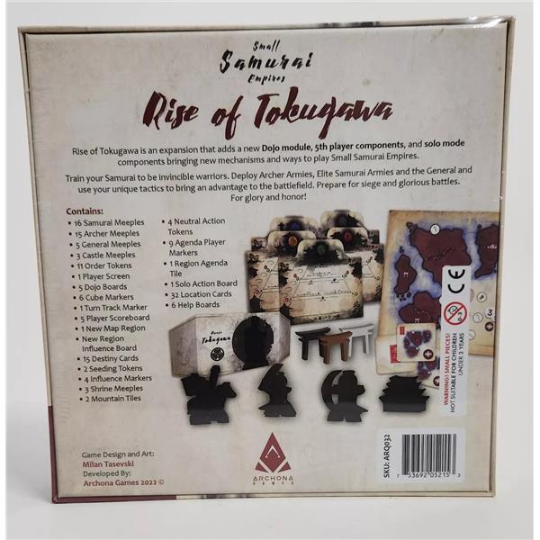 Rise of Tokugawa is an expansion for Small Samurai Empires, including a 5th player, solo mode, training grounds, a playmat and more!