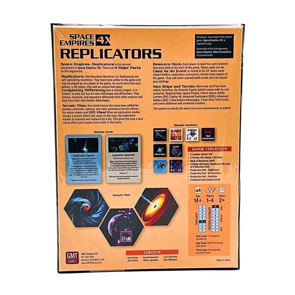 Space Empires: Replicators is the Second Expansion in the Space Empires series. It adds a number of cool features to the Space Empires base game. It was designed to add decisions and some extra replay-ability without adding time to the game.
