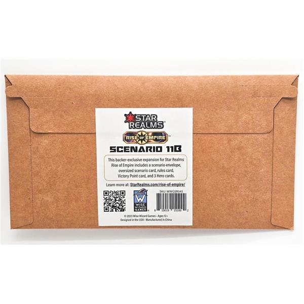 This backer-exclusive expansion for Star Realms Rise of Empire includes a scenario envelope, oversized scenario card, rules card, Victory Point card, and 3 Hero cards.