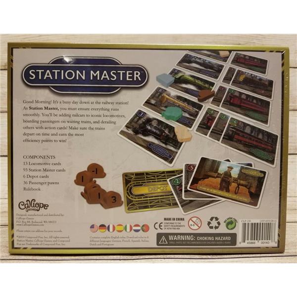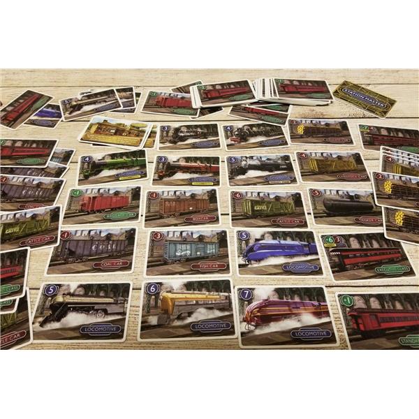 Station Master is a train-themed card game for 2-6 players. In the game, players are working at the station, attaching railcars to Locomotives and boarding passengers on trains, trying to score the most Efficiency Points to win!