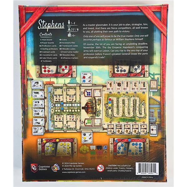 In Stephens, players compete amongst one another in the role of master glassmakers working at the famous "Stephens" Factory to become the most prestigious figure in town...after Stephens, of course. Through clever and cunning planning, all players will develop their works, invest in new businesses, and promote the creation of jobs. Through a unique action-selection mechanism, on their turn players choose from a variety of options, either by activating the Stephens factory or by activating one of their personal investments.