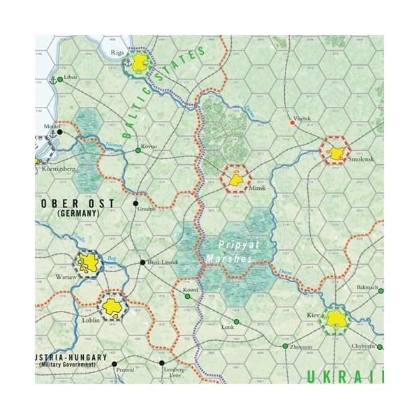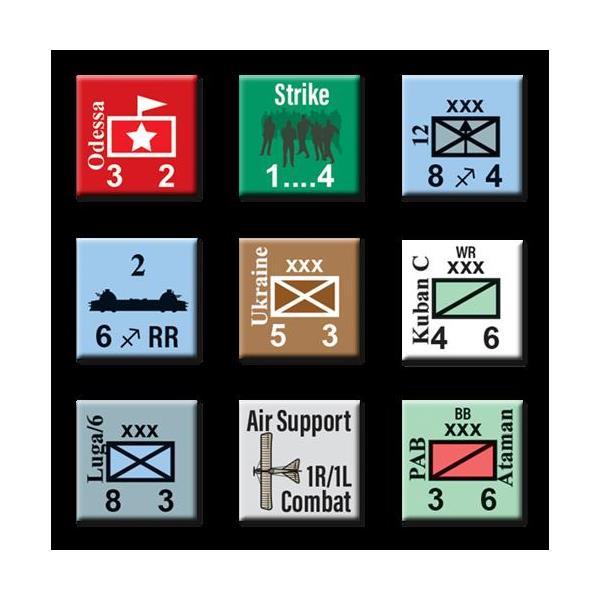 Each game turn represents one to ten days of operations. Each hexagon (hex) on the map represents 60 kilometers (40 miles). Each unit represents anything from a brigade up to corps. Strategic markers represent specialized forces, such as airpower, and agitprop (agitation and propaganda).
