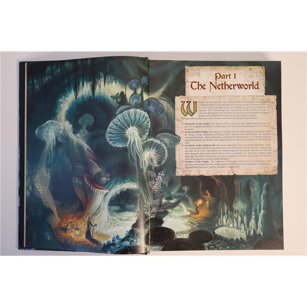 Daily Life in the Depths. How do you live, eat, breathe, and drink when you live without sunlight? The Netherworld is a world of its own, with its obstacles and limitations, but also its opportunities, owing to a dense magic. Protective seals, roots of Eana, and bioluminescent plants make up a wondrous and radically new environment for whoever ventures in these depths. Each element of the Netherworld is given pride of place through memorable scenarios or scenes featured in rich adventure hooks.