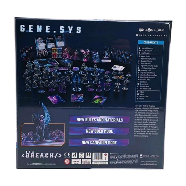 The Breach is a competitive Net Crawler game for 1-4 players, lasting approximately 25 minutes per player, where they attempt to breach the Gene.sys database to steal secret information. Each player is a Breacher, a digital rebel, guided by their ideals or by their Faction interests.