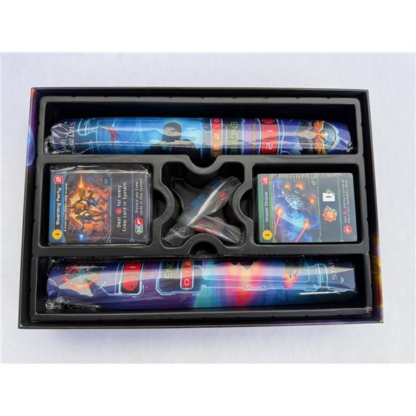 - 2 Neoprene Ship Mats - 54 System Cards - 30 Crew Cards - 16 Malfunction Cards - 18 Starting Cards - 2 Reference Cards - 10 Acrylic Tracker Cubes - 1 Rulebook