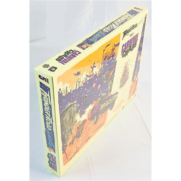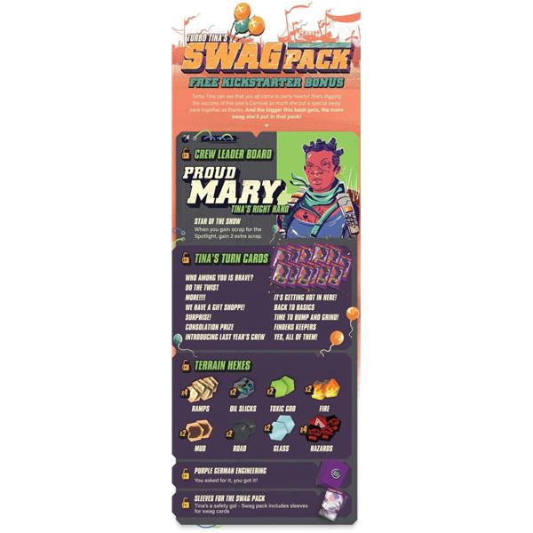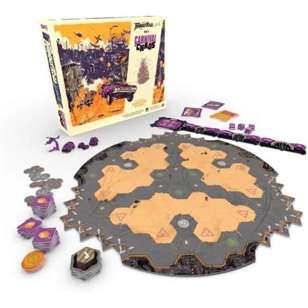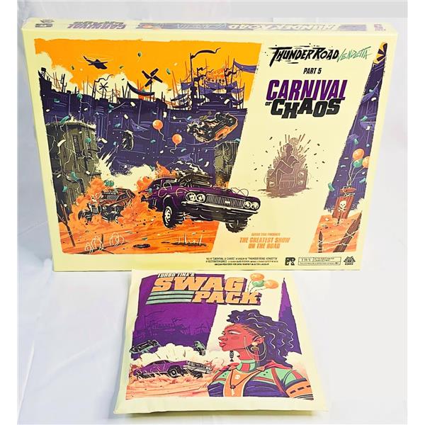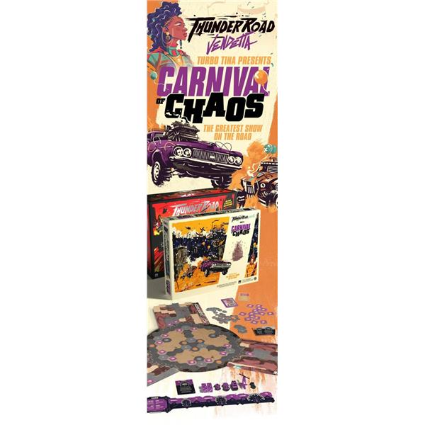Carnival of Chaos is an expansion for Thunder Road: Vendetta (or Thunder Road: Vendetta – Maximum Chrome) that offers a new way to play. Players race their cars into the arena, collecting wild party favors, powerful super-weapons, and precious scrap along the way. This expansion also includes a full set of vehicles and a dashboard, so you can play with a fifth player using this expansion or in the regular game.