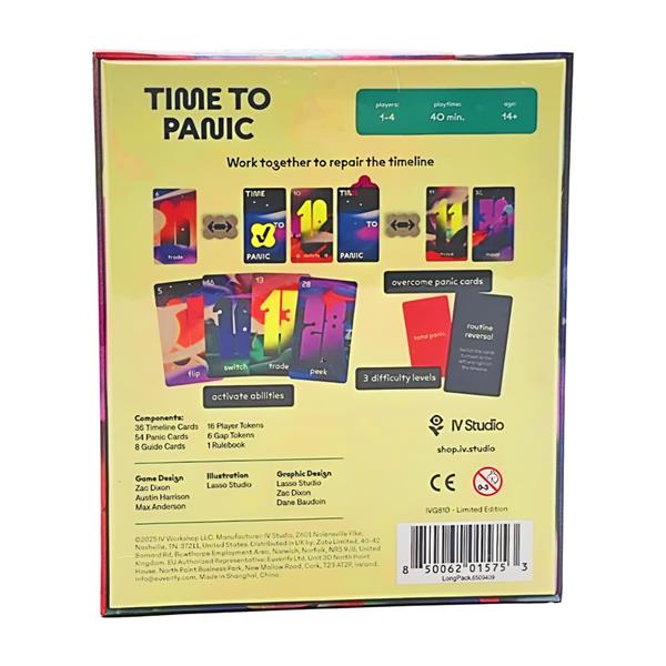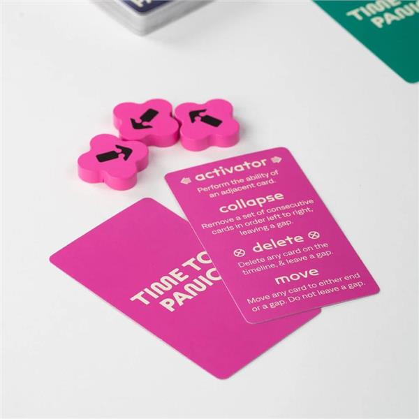 A catastrophic anomaly has shattered the fabric of time, leaving history in disarray. Your team — an elite group of multiversal agents — must work together to repair the timeline before it’s too late. By carefully manipulating events back in to chronological order, you will restore balance to reality. On each turn, you will place a card back into the time line and activate its ability. Then draw a new panic card to resolve, sowing extra chaos in the game. The fewer mistakes you make, the better your final score. A perfect game results in a completely accurate timeline with no misplaced events. But beware, if too many events are misplaced, history may be lost forever.