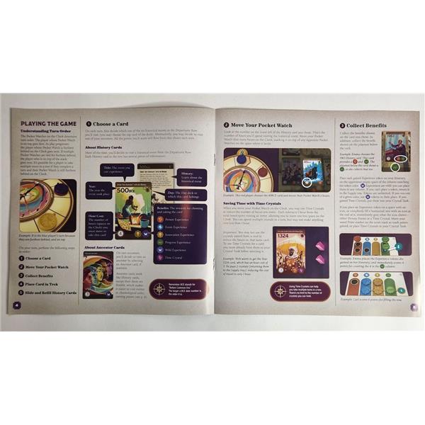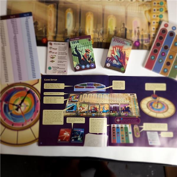 On each turn, you choose to visit one historical event, and spend a certain number of hours doing it. Doing so will yield benefits, like checking off items on your itinerary for points, and earning Time Crystals so you can bend the space-time continuum on future turns.