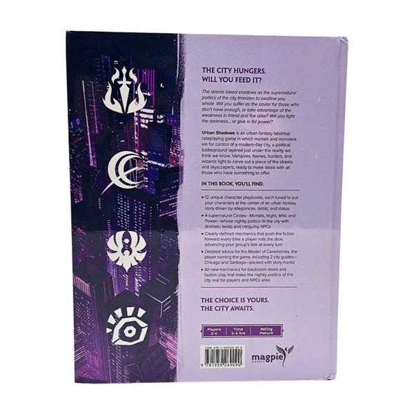 Urban Shadows is a political urban fantasy tabletop roleplaying game in which mortals and supernaturals alike vie for power in a modern-day city. Vampires, faeries, hunters, wizards, and more clash in the shadows...or make backroom deals for their piece of the streets and skyscrapers. No one is ever safe, and everything is always at stake.
