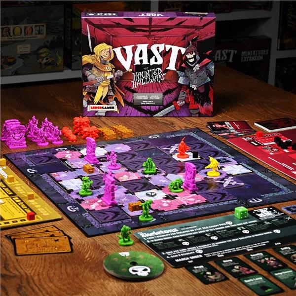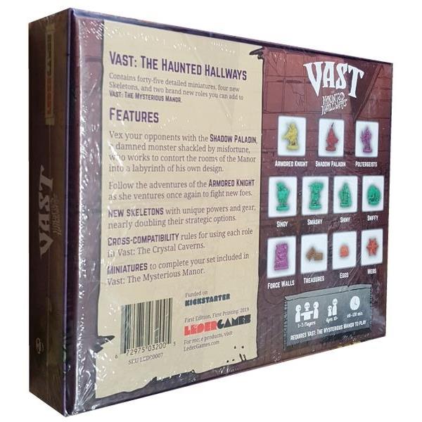 The Haunted Hallways introduces two new roles: the Shadow Paladin and Armored Knight. New skeletons with unique powers and gear appear, nearly doubling their strategic options. Gain over forty detailed plastic miniatures, including force walls, treasures, eggs, and webs. Add replayability with Cross-Compatibility rules for using each role in Vast: The Crystal Caverns.