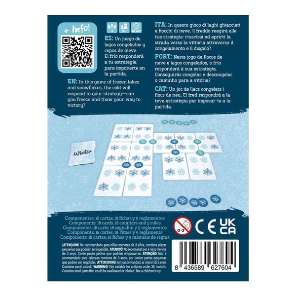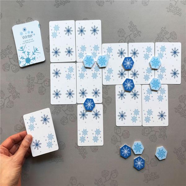 In Winter, two players compete to be the player with the most chips of their color on the lake at the end of the game. The game is divided into two phases. In the first, the freezing phase, players will create the frozen lake in a contiguous form using their snowflake cards. They’ll also attempt to secure zones in which they’ve managed to group four snowflakes of their color using chips. In the second phase, the unfreezing, they’ll undo the creation by moving and retrieving their cards and chips of their color. At the end of the game, the player with the most chips on the table is declared the winner.