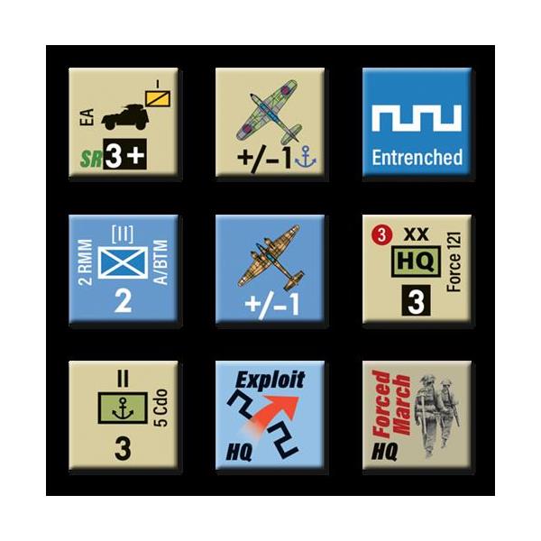 Each player is provided with units representing land, air and naval formations. Players move their pieces on the map to engage enemy forces and take critical objectives. Each player has a set of Operations markers which enhance unit actions and take special actions.