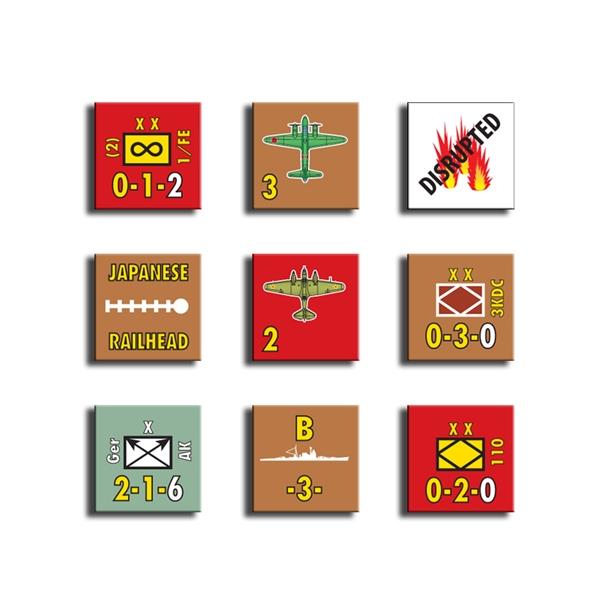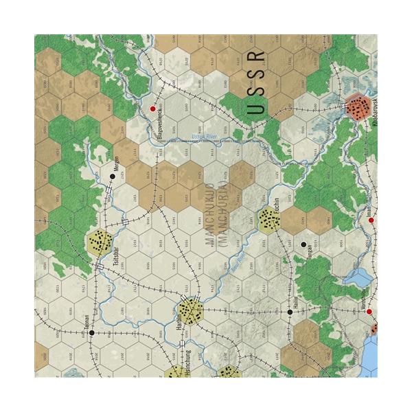 The map shows Northeast Asia as it was in 1941, with each hex on the map equaling roughly 37 miles (60 kilometers) from side to opposite side. Each game turn represents one month of operations. The units are brigades, divisions and corps.