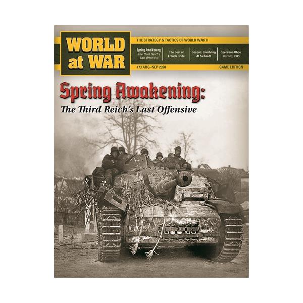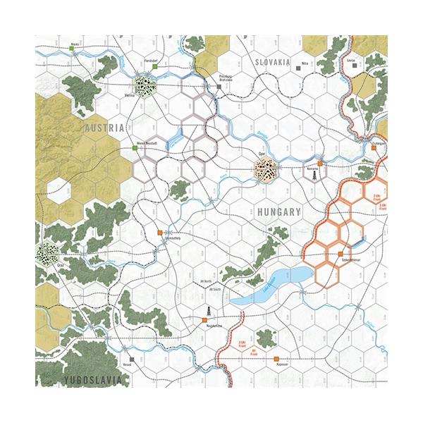Spring Awakening is a two player wargame of Operation Fruhlingserwachen, the final major German offensive of World War II. The German plan was to launch a two-pronged attack to secure a defensive zone for the Lake Balaton oilfields in northern Hungary. The offensive failed in the face of Soviet resistance, and the ensuing Red Army offensive swept into Vienna. While historically, the situation was dismal for the Third Reich, the objective is for players to do better than their historical counterparts. Each side is divided into two sub-commands. For the Axis, this includes the Nord Armee Kommando and Sud Armee Kommando, for the Soviets, the Third Ukrainian and parts of Second Ukrainian Fronts, as well as a Bulgarian army and a Yugoslav corps. The scenario starts on 6 March 1945 (the opening of Spring Awakening) and carries through to 16 April (following the Soviet capture of Vienna). Each game turn represents one week of operations. Each hex is 18 kilometers across. Most ground units are corps, representing two to five divisions.