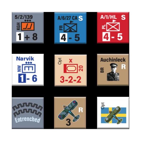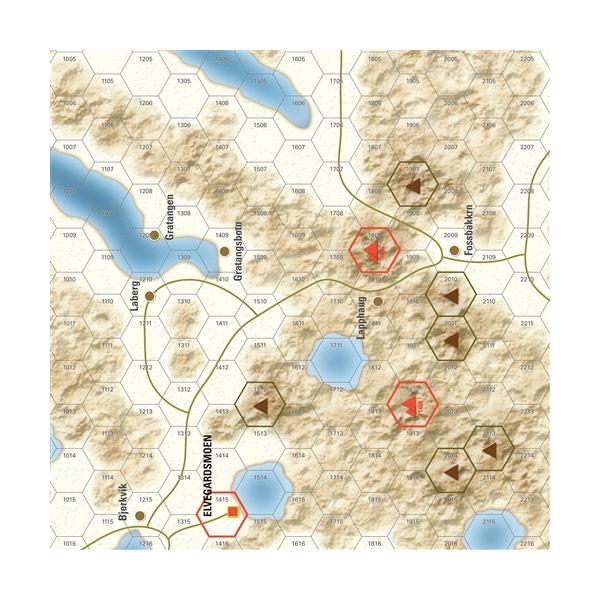 Narvik 1940 is a two-player wargame of low to intermediate complexity that simulates the battles around Narvik, Norway in 1940. To control complexity and present an overall force commander’s view of the battle, the game uses a tactically scaled map and units of maneuver coupled with an operationally scaled turn length. The Allied player is normally on the offensive, trying to clear the Germans from the Narvik area, but the German player has opportunities for counterattacks. The game starts in mid-April, after the Germans seized control of Narvik and just as the Allies have made their initial landings to begin their counteroffensive. Narvik models a battle fought in Arctic conditions with extremes of weather and long daylight hours. There was a chaotic command system on the Allied side and an overextended force on the German.