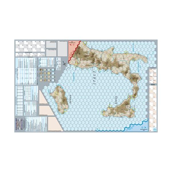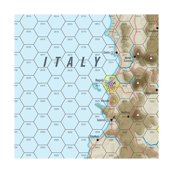 W94 Kesselring’s War: Decision in Italy 1943-44 (Joseph Miranda) is an operational level two player wargame covering the campaign in Sicily and southern Italy, July 1943 to February 1944. The game covers the months from Operation Husky through the initial landings in the southern peninsula up to the Anzio invasion and first battle of Monte Cassino. This was the time when the Allies could have gained a decisive victory but were stopped when German forces under the command of Field Marshal Albert Kesselring fought a series of delaying actions and then held a line south of Rome. The game system portrays operations across the theater within a framework of logistical and command/control restraints, modeled as Action Points. The objective of the Allied player is to seize major objectives in Italy, while the Germans are trying to stop them or, by judicious counterattacks, turn the tide in the Mediterranean Theater of Operations. Each hex on the map is approximately 30 kilometers across.